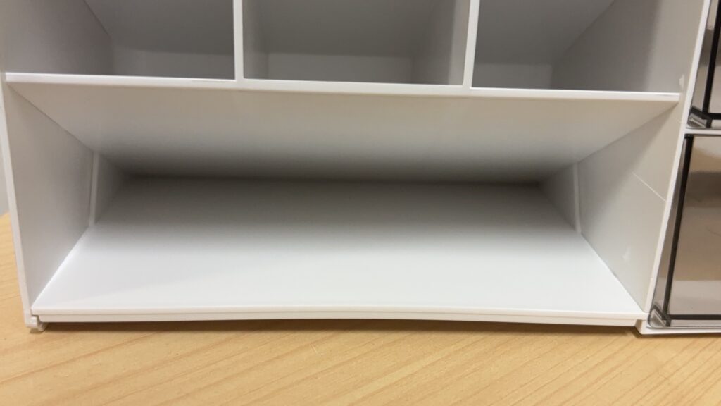下の段は奥が狭まっていますが、幅が広いメモ帳などが入れられます。手に取りやすい場所なので、よく使うものを収納するのがおすすめです。